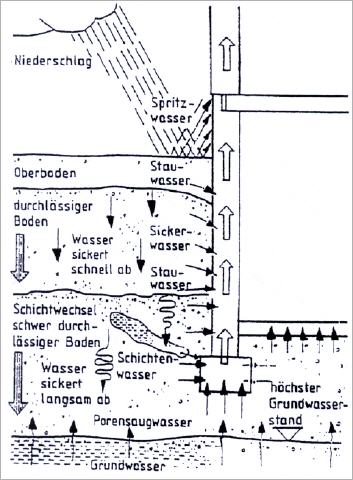 Grundwasser und stauendes bzw. nicht rasch versickerndes Niederschlagswasser wird als so genanntes drückendes Wasser bezeichnet, da es einen hydrostatischen Druck auf eine Wand ausübt. Nichtstauendes Niederschlagswasser, Sickerwasser und Brauchwasser übt keinen hydrostatischen Druck aus (so genanntes nicht drückendes Wasser).