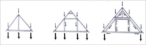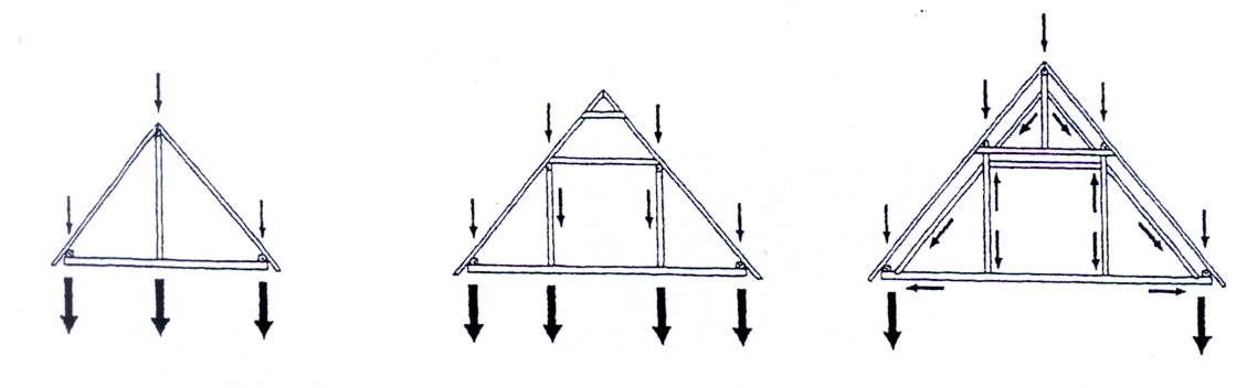 a) Pffettendach mit Firstpfette, senkrechte Lastableitung über Mittelstütze und Außenwände