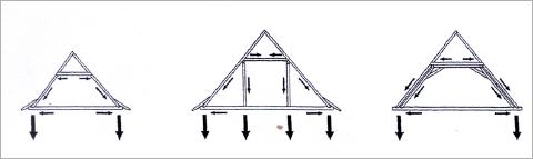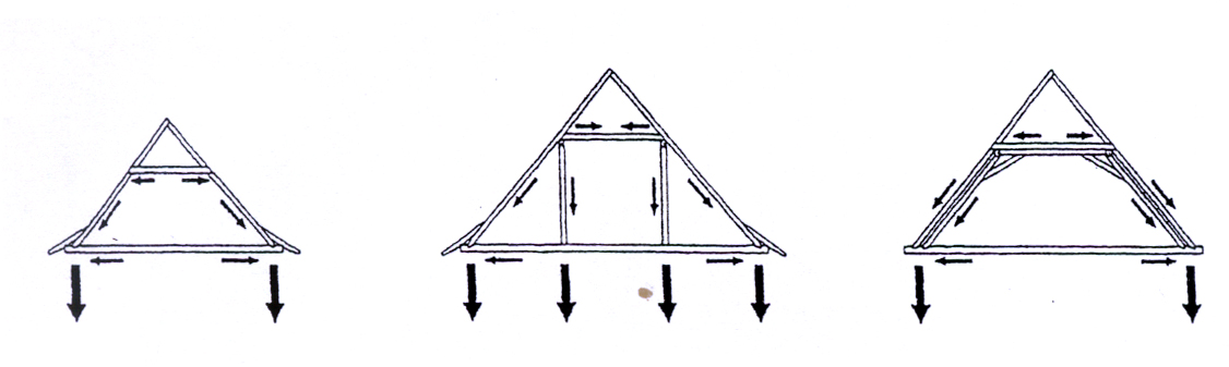 a) Einfaches Sparrendach mit Kehlbalken, Ableitung der Dachlast in der Sparrenebene, Deckenbalken auf Zug beansprucht