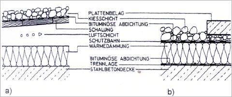 Flachdächer werden entweder als einschalige, nicht durchlüftete Dächer (sogenannte Warmdächer) oder als zweischalige, durchlüftete Dächer (sogenannte Kaltdächer) ausgeführt.