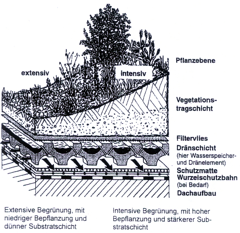 Extensive Begrünung | Niedrig wachsende Kräuter und Trockengräser, z.B. Moose, Steingartengewächse | Ohne Bewässerung, geringer Pflegeaufwand, Unterhaltung preiswerter als bei konventionell gedeckten Dächern |