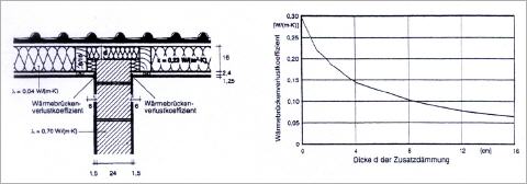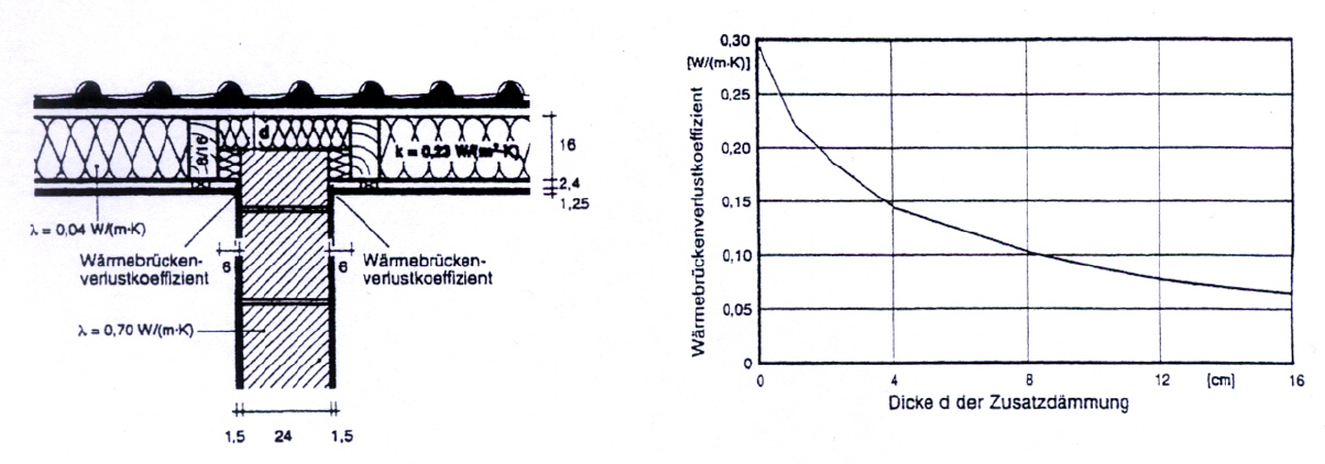 Ein typisches Beispiel für eine Materialbedingte Wärmebrücke ist die in der Abbildung dargestellte Einbindung einer Innenwand in eine gedämmte Dachkonstruktion. Abhängig von der Stärke einer zusätzlichen Kopfdämmung kann der Einfluss dieser Wärmebrücke soweit reduziert werden, dass eine Tauwasserbildung am Übergangspunkt zwischen Innenwand und Dachkonstruktion verhindert wird.