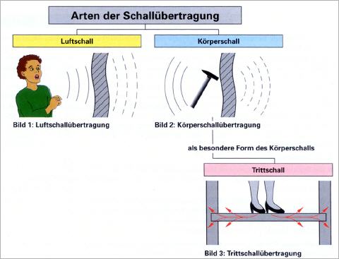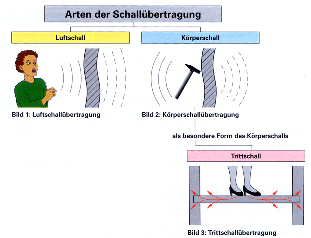 Bei der Schallübertragung unterscheidet man zwischen Luft- und Körperschall. Trifft der Schall bei seiner Ausbreitung auf ein Hindernis (z.B. ein Bauteil), werden grundsätzlich drei verschiedene physikalische Vorgänge unterschieden: