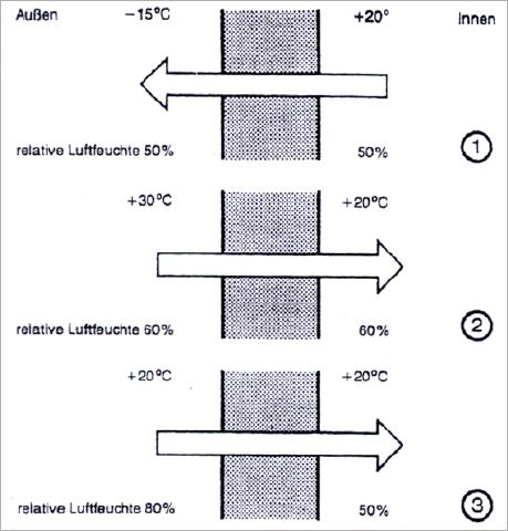Als Wasserdampfdiffusion bezeichnet man die Eigenbewegung des Wasserdampfes durch Bau- und Dämmstoffe hindurch. Triebkraft hierfür sind unterschiedliche Wasserdampfdrücke auf den beiden Seiten eines Bauteils. Der in der Luft enthaltene Wasserdampf wandert von der Seite des höheren Dampfdrucks in Richtung des Druckgefälles. Der Wasserdampfdruck ist von der Temperatur und der relativen Luftfeuchtigkeit abhängig. Die folgende Abbildung zeigt die Wasserdampfdiffusion bei unterschiedlichen klimatischen Bedingungen.