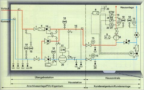 Die sogenannte Hausstation bildet bei der Wärmeversorgung mit Fernwärme das „Bindeglied“ zwischen Energieversorger und Betreiber. Sie besteht in den meisten Fällen aus einer Übergabestation und der Hauszentrale. Die Übergabestation enthält alle Einrichtungen, die erforderlich sind, um die Fernwärme in der vertraglich vereinbarten Form an den Abnehmer übergeben zu können. Dazu zählen in erster Linie Wärmetauscher und Wärmemengenzähler. In der Hauszentrale sind alle Teile und Anlagenkomponenten zusammengefasst, die für das einwandfreie Arbeiten der Heizungsanlage verantwortlich sind (Pumpen, Stell- und Regelventile etc.). Die technische Abgrenzung von Übergabestation und Hauszentrale muss nicht unbedingt die Eigentumsgrenze darstellen, in vielen Fällen ist die Übergabestation aber Eigentum des Fernwärmeunternehmens, während die Hauszentrale dem Abnehmer gehört.