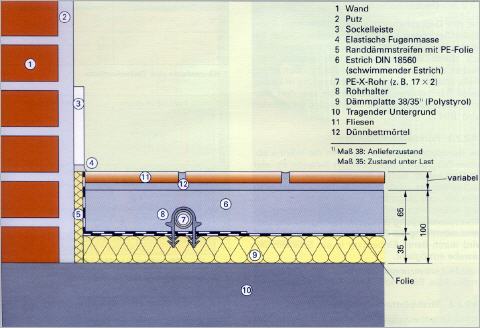 - Für eine Trockenverlegung werden die Rohrleitungen auf vorgefertigten - mit Kanälen oder Rinnen versehenen - Dämmstoffschichten verlegt. Bei diesem Verfahren kann meist auf besondere Rohrbefestigungen etc. verzichtet werden. Außerdem können sich die Heizungsrohre ungehindert ausdehnen. Über den Rohrleitungen wird entweder Estrich (ca. 45 mm) vergossen oder Trockenbauplatten bzw. Fliesen verlegt. Zum Teil werden auf den Rohrleitungen Metall-Platten angebracht, um die Wärmeabgabe zu erhöhen.