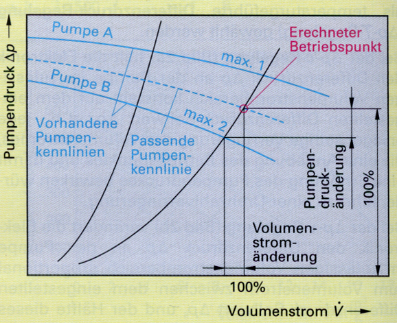 Das Betriebsverhalten einer Pumpe wird durch die Pumpen- und die Anlagenkennlinie bestimmt. Die bauartspezifische Pumpenkennlinie gibt die Beziehung zwischen Förderhöhe und dem Förderstrom bzw. der Leistung bei konstanter Pumpendrehzahl wieder. Die Anlagenkennlinie (auch Rohrleitungskennlinie) wird für eine bestimmte Heizungsanlage im Einzelfall ermittelt und stellt die Beziehung zwischen der Förderhöhe (oder dem Druckverlust) und dem Förderstrom bzw. der Leistung dar. Der Betriebspunkt ist durch den Schnittpunkt der beiden Kennlinien bestimmt und variiert abhängig von der aktuellen Leistungsnachfrage (Voll-Last oder gedrosselte Teillast).