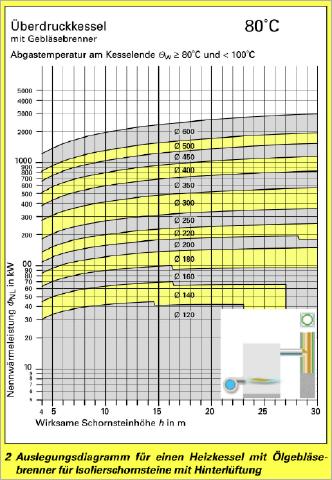 Bei sehr großen Schornsteinquerschnitten stellt sich grundsätzlich ein relativ kleiner Unterdruck am Kessel ein, da sich die Abgase sehr stark abkühlen können. Mit abnehmendem Durchmesser steigt der Unterdruck an, weil sich die Auftriebskraft im Schornstein in Folge der geringeren Abkühlung der Abgase vergrößert. Die Strömungswiderstände aufgrund niedrigerer Strömungsgeschwindigkeiten nehmen dabei zuerst nur geringfügig zu. Wird der Durchmesser noch weiter verringert, steigt einerseits der Unterdruck langsam nur weiter an. Andererseits wirken den größer werdenden Auftriebskräften dann aber die wachsenden Strömungswiderstände entgegen.