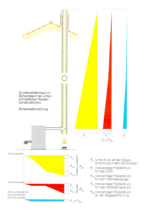 Der Zugbedarf (pz) ergibt sich aus dem Druckunterschied der für die Verbrennung im Wärmeerzeuger (pw) zur Überwindung der Strömungsverluste im Abgaskanal (pA) und bei der Zuluftzufuhr (pL) erforderlich sind.