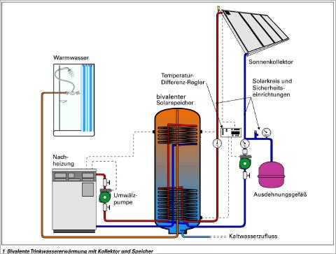 Die Warmwasserspeicher von Solaranlagen sind in der Regel größer dimensioniert als Warmwasserspeicher, die aus Komfortgründen bei konventionellen gas- oder ölgefeuerten Anlagen eingesetzt werden. Um trübe Tage zu überbrücken, müssen die Speicher für Solaranlagen Warmwasser für mindestens zwei Tage vorhalten und haben damit auch für ein Einfamilienhaus ein Speichervolumen von mehr als 800 I.