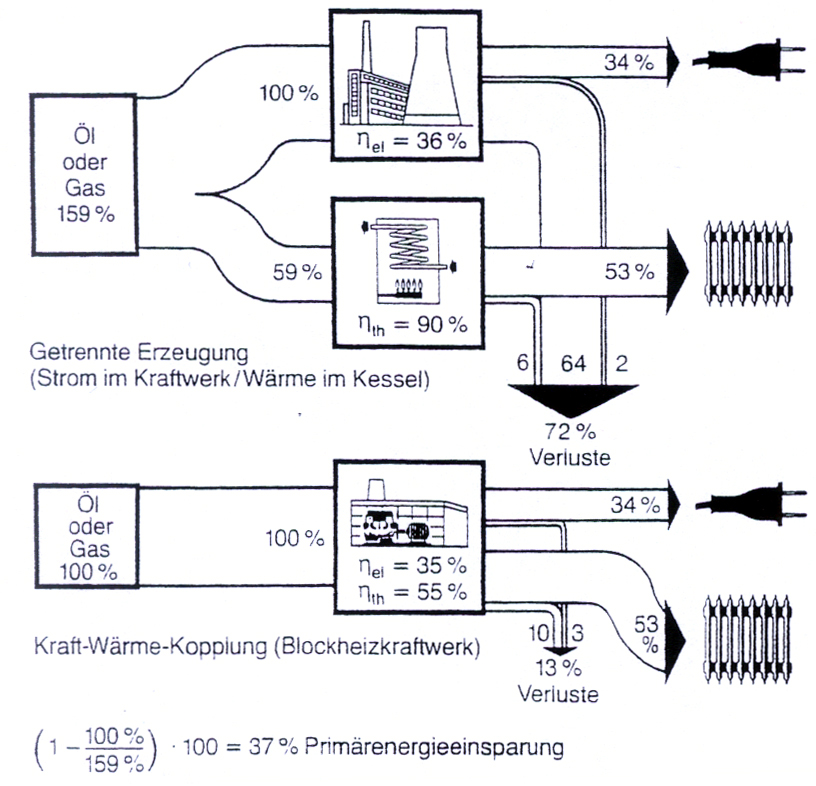 Wenn beim Endverbraucher 34 kWh elektrische Energie und 53 kWh Heizenergie zur Verfügung stehen sollen, müssen bei einer getrennten Erzeugung von elektrischer Energie und Heizenergie insgesamt 159 kWh Primärenergie in Form von Gas oder Öl eingesetzt werden.