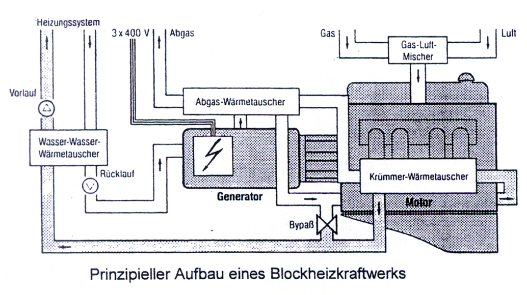Abhängig von der objektspezifischen Wärme- und Strombedarfsstruktur erfolgt dann die Auslegung und Steuerung der BHKW-Anlage entweder wärmegeführt, d.h. ausgerichtet auf den Bedarf an Heiz- und Prozesswärme (überschüssiger elektrischer Strom fällt aufgrund des objektspezifischen Strombedarfs nicht an oder wird ggf. in das öffentliche Netz eingespeist), stromgeführt, d.h. ausgerichtet auf den Bedarf an Strom (überschüssige Wärme fällt aufgrund des objektspezifischen Wärmebedarfs nicht an oder wird ggf. abgeführt) oder strom-/wärmegeführt, d.h. an einer Bedarfsorientierten Mischung der Parameter des Wärme- und Stromverbrauchs ausgerichtet.