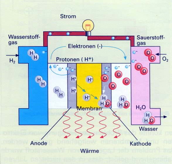 Unabhängig vom Zellentyp wird in jeder Brennstoffzelle ähnlich wie bei einer Batterie auf elektrochemischem Weg aus Wasserstoff und Sauerstoff Strom erzeugt. Für den Einsatz im Bereich der Haustechnik (und im Kfz-Antrieb) scheinen sich derzeit aber nur Brennstoffzellen anzubieten, die nach dem PEM-System (Proton Exchange Membrane) arbeiten. Im Folgenden wird an diesem Beispiel das Prinzip der Energieerzeugung in einer Brennstoffzelle beschrieben.