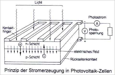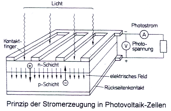 Das Kernstück der Solarzellen bilden Elemente aus Halbleitermetallen, in die auf der oberen, dem Licht zugewandten Seite „leichtere“ Fremdatome (n-Schicht) und auf der unteren Seite „schwerere“ Fremdatome (p-Schicht) gezielt eingelagert werden (z.B. Silicium mit Bor in der n-Schicht und Phosphor in der p-Schicht). Wenn Sonnenlicht auf das so behandelte Material fällt, werden freibewegliche Elektronen und ebenfalls frei bewegliche „Löcher“ (auch „Elektronenfehlstellen“ genannt) in der Kristallstruktur des Halbleitermaterials angeregt. Die Elektronen wandern dabei zur n-Schicht, die Löcher zur p-Schicht. Über die Metallkontakte auf der Front- (Kontaktfinger = Minuspol) und an der Rückseite (Pluspol) wird ein Spannungsausgleich hergestellt und Gleichstrom in das Verbrauchernetz eingespeist.