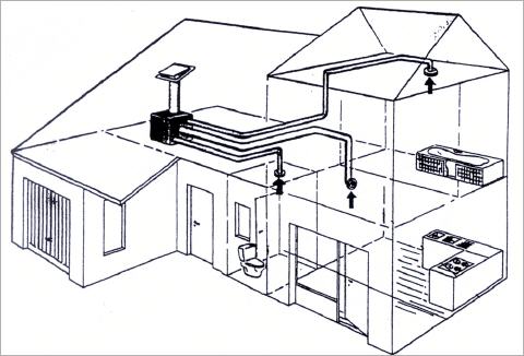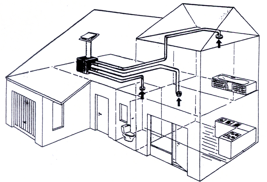 Kontrollierte Abluftsysteme erlauben es, die Frischluftzufuhr in einem Gebäude auf den tatsächlichen Bedarf abzustellen. Sie bestehen im Wesentlichen aus einem oder mehreren Abluftventilatoren, die die feuchte- und Geruchsbeladene Luft in Bädern und Küchen etc. absaugen (siehe Abb. 52). Dadurch wird ein Unterdruck im Gebäude erzeugt. Dieser Unterdruck wird über Zuluftöffnungen in den Aufenthaltsräumen ausgeglichen, durch die frische Außenluft in das Gebäude strömt. Sind keine Zuluftöffnungen vorhanden (oder verschlossen) strömt die Luft unkontrolliert über Fugen in der luftdichten Hülle in das Gebäude.