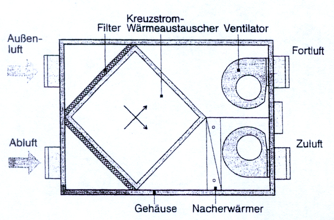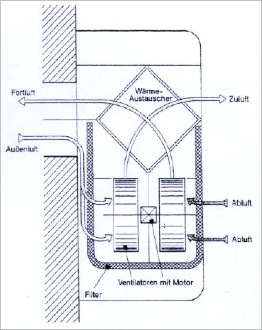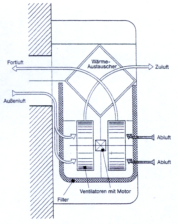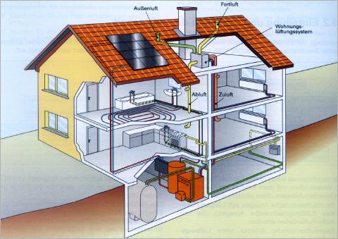 Bei Systemen mit einer kontrollierten Be- und Entlüftung wird sowohl die Frischluft als auch die Abluft über eigene Lüftungskanäle geführt. Bei den meisten Systemen sind die beiden Kanäle durch einen Wärmetauscher „verbunden", so dass ein Teil der Wärme aus der Abluft an die Zuluft übertragen werden kann. Mit marktgängigen Systemen ist es möglich, bis zu etwa 90% der Wärmeenergie aus der Abluft zurückzugewinnen und für die Erwärmung der Frischluft zu nutzen.