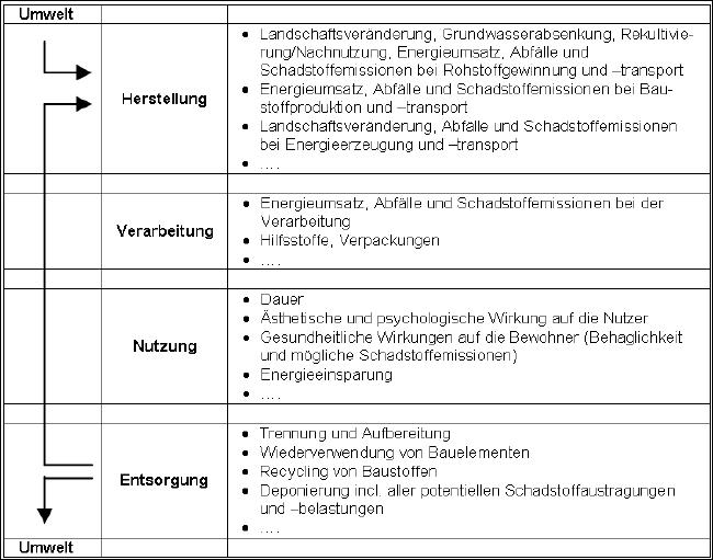 Für eine Einteilung von Baustoffen nach ökologischen Kriterien ist es nicht ausreichend, sich auf ökologische Einzelaspekte, wie z.B. die Recyclingfähigkeit, zu beschränken. Es ist bei einer Bewertung (und einer darauf aufbauenden Einteilung) nach ökologischen Gesichtspunkten grundsätzlich der gesamte Lebensweg eines Baustoffes zu bilanzieren, von der Herstellung bzw. Rohstoffgewinnung über die Verarbeitung und Nutzung bis hin zu einer späteren Entsorgung. |