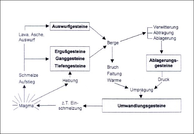 Sedimentgesteine entstehen durch die Ablagerung des Verwitterungsmaterials anderer Gesteine, durch chemische oder organische Prozesse. Magmagesteine erstarren aus einer Schmelze (Magma). Metamorphe Gesteine bilden sich in der Erdkruste durch Umwandlung anderer Gesteine unter Einfluss hoher Temperaturen und hoher Drucke.