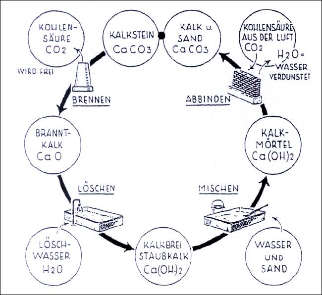 Beim Brennen von Calciumcarbonat bei Temperaturen um 900 °C entsteht gebrannter Kalk (CaO) und Kohlendioxid (CO2). Durch Zufügen von Wasser („Ablöschen“) wird unter erheblicher Wärmeentwicklung und Volumenvergrößerung gelöschter Kalk (Calciumhydroxid) gebildet. Beim Anmischen des Löschkalks mit Wasser und Sand entsteht Mörtel, der wiederum mit dem CO2 aus der Luft reagiert, wodurch der Ausgangsstoff Calciumcarbonat gebildet wird. Das Carbonat verkittet als feinkörnige, kristalline Masse Sand mit den Bausteinen. Bei dieser Abbindereaktion (Carbonatisierung) tritt Wasser aus (Neubaufeuchte), das Gelegenheit zur Verdunstung haben muss. |