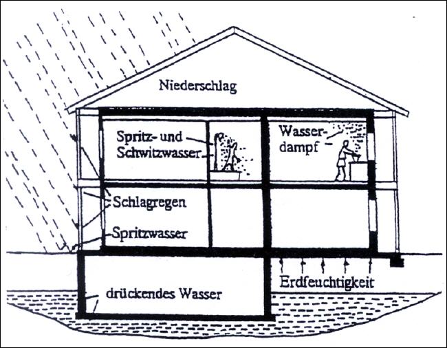 Feuchtigkeit kann von außen durch Grundwasser, Niederschlagswasser (Regen, Schnee) oder durch Wasserdampf (in Form von feuchter Luft) auf die Bauteile einwirken. Von innen kann das Gebäude durch Wasser (z.B. in Bädern, Küchen), Wasserdampf (Mensch, erhitztes Wasser), Kondenswasser sowie Baufeuchte (Feuchtigkeit, die während der Errichtung des Gebäudes durch anfallendes Wasser in die Bauteile gelangt, z.B. durch Anmachwasser, Regenwasser) beeinflusst werden.