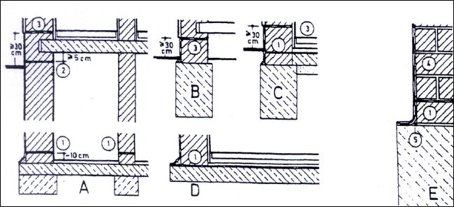 1. Sperrschicht über dem Kellerfußboden 2. Sperrschicht unter der Kellerdecke 3. Sperrschicht über Spritzwassersockel 4. vertikale Sperrschicht gegen seitliche Bodenfeuchtigkeit 5. Mörtelkehle Ø 80 mm