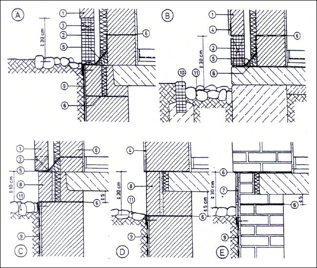 A) Zweischaliges Luftschichtmauerwerk – Erdgeschoßboden auf Geländehöhe B) Zweischaliges Luftschichtmauerwerk – Erdgeschoßboden oberhalb Geländehöhe C) Ausführung wie B aber mit Schalenfuge D) Einschaliges Mauerwerk mit Klinkersockeln und Schalenfuge E) Einschaliges Verblendmauerwerk mit einem Sockel aus keramischen Spaltplatten
