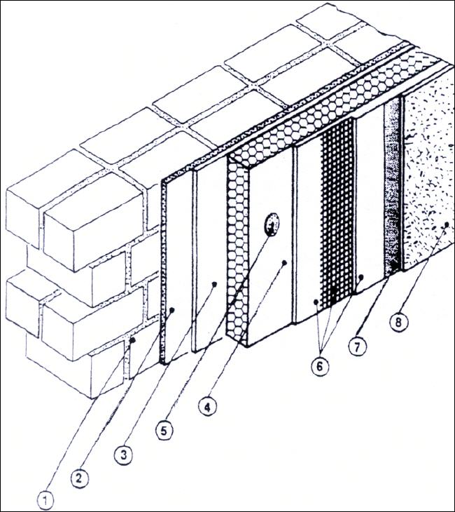1) Wandkonstruktion (Mauerwerk, Beton o.ä.) 2) Untergrund (tragfähige Schichten – vorhandener Putz o.ä.) 3) Klebemasse 4) Dämmplatte 5) Zusätzliche Befestigung (Dübel bei Bedarf oder Erfordernis) 6) Armierungsmasse und Glasfasergewebe 7) Voranstrich (falls erforderlich) 8) Schlussbeschichtung