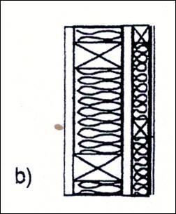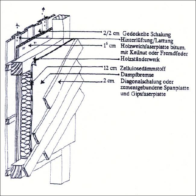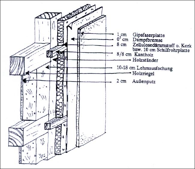 Eine der ältesten Holzbaukonstruktionen ist die Massivholz-Blockwand, die im Wohnungsbau aber nur sehr selten anzutreffen ist. Eine ebenfalls recht alte, insbesondere bei denkmalgeschützen Gebäuden häufig anzutreffende Wandkonstruktion stellen Fachwerkwände mit Holzskelett und Ausfachungen dar. Die ursprünglichste Technik bzw. Konstruktion für die Ausfachung besteht aus einem Flechtwerk mit Lehmstakung, das mit Strohlehm meist bündig zum Fachwerk verputzt wird. Auf der Außenseite dient ein Kalkanstrich mit Zusätzen (z.B. aus Leinöl) als Wasserabweisende Schicht. |