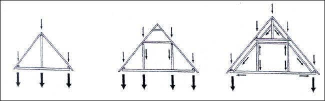 a) Pffettendach mit Firstpfette, senkrechte Lastableitung über Mittelstütze und Außenwände b) Pfettendach mit Mittelpfetten und stehendem Stuhl, Lastableitung über Stützen und Außenwände c) Pfettendach mit Spreng- und Hängewerk, Lastableitung ausschließlich über die Außenwände, aufgehängte Unterzüge als Auflage für Deckenbalken