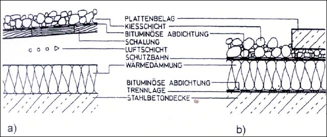 Äußere abdichtende Haut der Flachdachkonstruktion (nach DIN 18 195 Abdichtung genutzter Dachflächen) Anforderungen: Eignung für alle äußeren klimatischen Einflüsse und Nutzungsbeanspruchungen sowie Verträglichkeit mit verwendeten Baustoffen/Bauteilen sicherstellen, besondere Sorgfalt bei Abdichtungen von Anschluss-, Abschluss- und Durchdringungsbereichen
