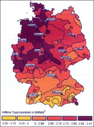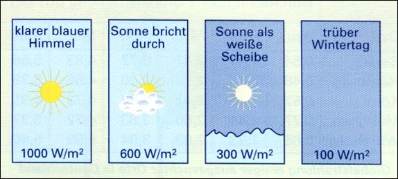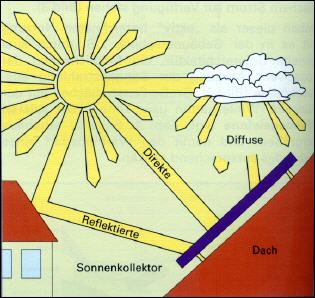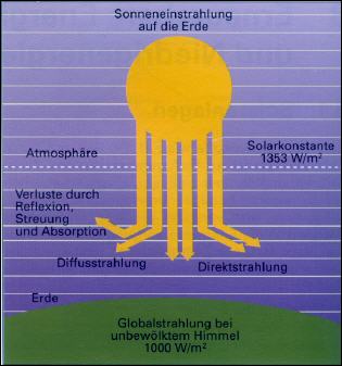Die diffuse Strahlung, d.h. der Anteil der Sonneneinstrahlung, der an den Luftmolekülen in der Atmosphäre gestreut wird, kann nur empirisch ermittelt werden. Für eine einfachere praktische Anwendung sind diese Strahlungsanteile in die Rechenwerte der DIN 4710 einbezogen und nicht gesondert dargestellt worden. |