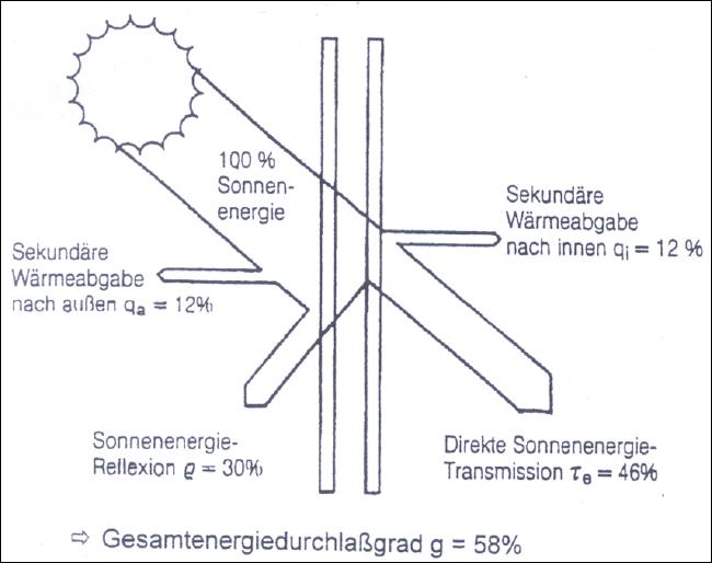 Die Wärmegewinne aus der Solarstrahlung werden durch die transparenten Flächen in ein Gebäude hinein getragen. Einfluss hat - neben der Orientierung dieser Flächen zur Sonne - der Jahres- und tageszeitliche Einfluss der Sonne, die Größe der Fensterfläche und vor allem der konstruktive / bauphysikalische Aufbau des Fensters. In der Abbildung ist die Strahlungsbilanz eines Fensters beispielhaft dargestellt. |