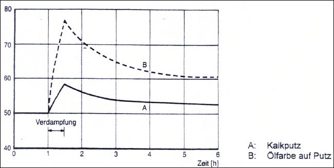 Die Wasserdampfsorption setzt sich aus Absorption und Desorption zusammen. Absorption bezeichnet die Aufnahme, Desorption die Abgabe von Feuchtigkeit durch die Umschließungsflächen eines Raumes. Zwischen diesen Vorgängen stellt sich ein bauphysikalisches Gleichgewicht ein. Für sehr große Räume ist dieser Vorgang unbedeutend, in kleinen Räumen mit hoher Feuchtigkeitsproduktion, u.a. durch Menschen und ihre Bedürfnisse hervorgerufen, aber sehr wichtig. In Abhängigkeit des gewählten Materials stellen sich verschiedene Feuchtigkeitsbelastungen der Umschließungsflächen ein. Die folgende Abbildung zeigt am Beispiel von Kalkputz und Ölfarbe auf Putz das unterschiedliche Sorptionsverhalten. |