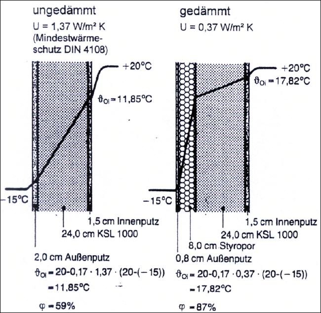 Bei Außenbauteilen mit schlechter Wärmedämmung (hoher U-Wert) besteht bei niedriger Außentemperatur die Gefahr der Unterschreitung der Taupunkttemperatur und damit der Tauwasserbildung auf Oberflächen der Rauminnenseite. Die Taupunkttemperatur gibt an, ab welcher Temperatur die Luft mit Wasserdampf gesättigt ist und ein weiteres Abkühlen zum Ausfallen von Wasser führt. Mit Hilfe der Temperatur und der relativen Feuchte der Raumluft kann die Taupunkttemperatur aus Tabellen (DIN 4108) bestimmt werden. Wenn die innere Oberflächentemperatur des Außenbauteils niedriger ist als die Taupunkttemperatur, kommt es zur Tauwasserbildung. Dies ist z.B. der Fall, wenn die Temperaturdifferenz zwischen Raumluft und innerer Wandoberfläche hoch ist. Zur Vermeidung von Tauwasser auf Oberflächen der Rauminnenseiten muss also gewährleistet sein, dass die Oberflächentemperatur größer als die Taupunkttemperatur ist. |