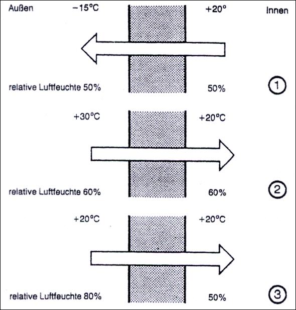 Als Wasserdampfdiffusion bezeichnet man die Eigenbewegung des Wasserdampfes durch Bau- und Dämmstoffe hindurch. Triebkraft hierfür sind unterschiedliche Wasserdampfdrücke auf den beiden Seiten eines Bauteils. Der in der Luft enthaltene Wasserdampf wandert von der Seite des höheren Dampfdrucks in Richtung des Druckgefälles. Der Wasserdampfdruck ist von der Temperatur und der relativen Luftfeuchtigkeit abhängig. Die folgende Abbildung zeigt die Wasserdampfdiffusion bei unterschiedlichen klimatischen Bedingungen.