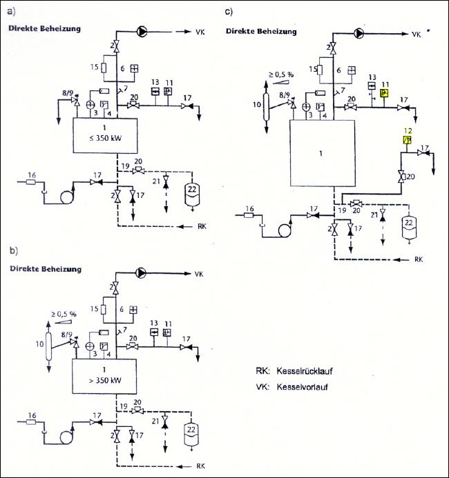 1) Heizkessel 2) Absperrventil Vorlauf/Rücklauf 3) Temperaturregler 4) Sicherheitstemperaturbegrenzer STB 6) Temperaturmesseinrichtung 7) Tauchhülse für Temperaturmesseinrichtung 8) Membransicherheitsventil MSV 2,5 bar/3,0 bar oder 9) Hubfedersicherheitsventil HFS ≥ 2,5 bar 10) Entspannungstopf ET in Anlagen > 350 kW – nicht in Anlagen bis 100 °C, wenn statt dessen zusätzlich je Heizkessel von STB mit einer Abschalttemperatur von 100 °C sowie ein Maximaldruckbegrenzer vorgesehen werden 11) Maximal-Druckbegrenzer – nur bei Sicherheitsventil > 3,0 bar 16) Rückflußverhinderer 13) Druckmessgerät 17) Kesselfüll- und Entleereinrichtung KFE 15) Wassermangelsicherung WMS – nicht in Anlagen ≤ 350 kW, wenn statt dessen je Heizkessel ein Minimal Druckbegrenzer oder Strömungswächter vorgesehen ist19) Ausdehnungsleitung 21) Entleerung vor Membranausdehnungsgefäß MAG20) Absperrarmatur, gesichert gegen unbeabsichtigtes Schließen durch z.B. verplombtes Kappenventil 22) Membranausdehnungsgefäß MAG