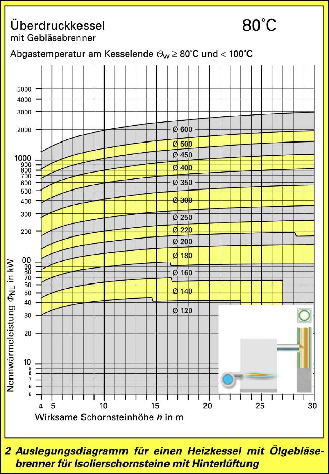 Bei sehr großen Schornsteinquerschnitten stellt sich grundsätzlich ein relativ kleiner Unterdruck am Kessel ein, da sich die Abgase sehr stark abkühlen können. Mit abnehmendem Durchmesser steigt der Unterdruck an, weil sich die Auftriebskraft im Schornstein in Folge der geringeren Abkühlung der Abgase vergrößert. Die Strömungswiderstände aufgrund niedrigerer Strömungsgeschwindigkeiten nehmen dabei zuerst nur geringfügig zu. Wird der Durchmesser noch weiter verringert, steigt einerseits der Unterdruck langsam nur weiter an. Andererseits wirken den größer werdenden Auftriebskräften dann aber die wachsenden Strömungswiderstände entgegen.