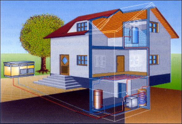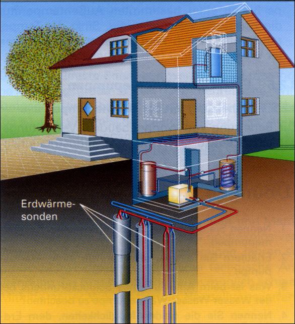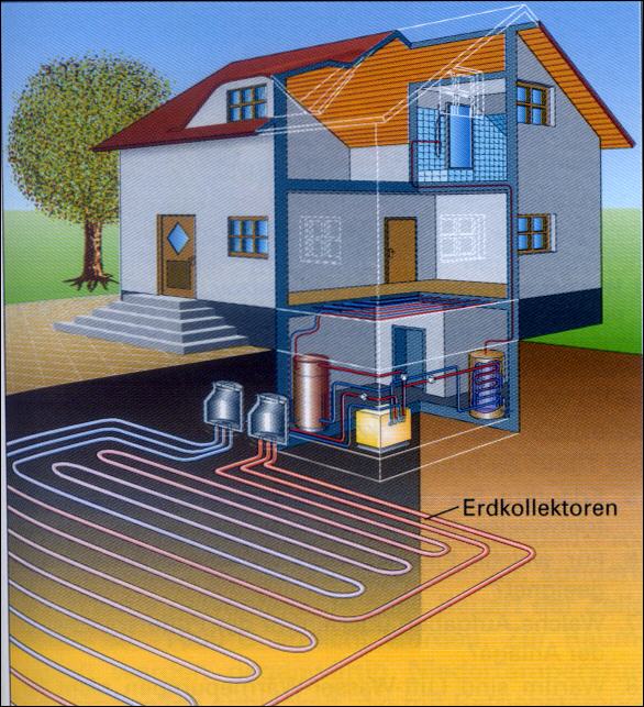 Um das Erdreich als Energiequelle zu nutzen, gibt es zwei Möglichkeiten. Entweder werden Erdsonden verwendet, bei denen die Rohrleitungen senkrecht bis auf Tiefen von z.B. 20 m in das Erdreich gebohrt werden. Aus dieser Tiefe kann mit dem Kältemittel ganzjährig die notwendige Wärmeenergie z.B. für eine Fußbodenheizung gefördert werden. Oder als Alternative wird ein so genannter „Erdreichkollektor“, ein mehrere hundert Meter langes Rohrleitungssystem, in einer Tiefe von etwa 1,50 m bzw. 20 cm unter der Frostgrenze verlegt.