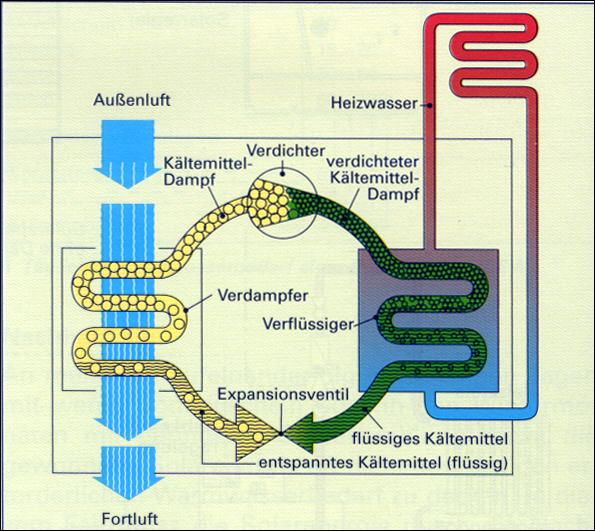 Wärmepumpen enthalten (wie Kühlschränke) in einem geschlossenen Rohrleitungssystem ein Kältemittel als so genanntes „Arbeitsmedium“. Diese Flüssigkeit siedet bereits bei niedrigen Temperaturen (z.B. bei 5 °C). Wenn das Kältemittel verdampft, wird der Umgebung (d.h. der Luft, dem Grundwasser oder dem Erdreich) Wärme entzogen. Dabei geht das Arbeitsmedium vom flüssigen in den gasförmigen Zustand über. Der Kältemitteldampf wird dann von einem Verdichter angesaugt und komprimiert (durch einen Adsorber oder Kompressor). Bei dieser Verdichtung steigt die Temperatur des Kältemittels stark an. Die dabei freiwerdende Energie wird über einen Wärmetauscher an das Heiz- oder Brauchwasser abgegeben. Bei diesem Vorgang verflüssigt sich das Kältemittel wieder, der noch vorhandene (Rest-)Druck wird mit Hilfe eines Expansionsventils abgebaut und der Kreislauf beginnt von neuem.