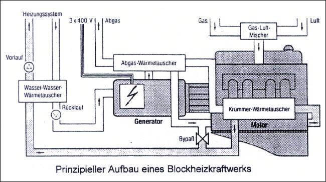 Die wichtigsten Komponenten eines BHKWs bilden der Motor, der Generator und die Wärmetauscher. Dazu kommen noch Komponenten wie Schutz-, Meß- und Steuerungseinrichtungen, Schallschutz sowie die Anschlüsse an die Hauselektrik, das Warmwassersystem und Abgasleitungen. |