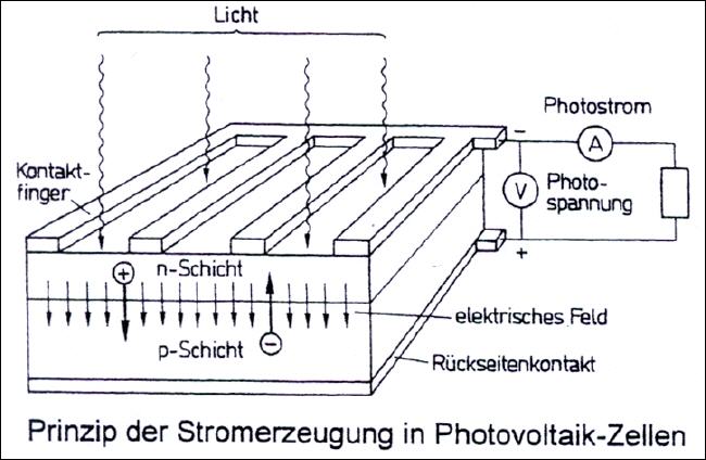 Das Kernstück der Solarzellen bilden Elemente aus Halbleitermetallen, in die auf der oberen, dem Licht zugewandten Seite „leichtere“ Fremdatome (n-Schicht) und auf der unteren Seite „schwerere“ Fremdatome (p-Schicht) gezielt eingelagert werden (z.B. Silicium mit Bor in der n-Schicht und Phosphor in der p-Schicht). Wenn Sonnenlicht auf das so behandelte Material fällt, werden freibewegliche Elektronen und ebenfalls frei bewegliche „Löcher“ (auch „Elektronenfehlstellen“ genannt) in der Kristallstruktur des Halbleitermaterials angeregt. Die Elektronen wandern dabei zur n-Schicht, die Löcher zur p-Schicht. Über die Metallkontakte auf der Front- (Kontaktfinger = Minuspol) und an der Rückseite (Pluspol) wird ein Spannungsausgleich hergestellt und Gleichstrom in das Verbrauchernetz eingespeist.