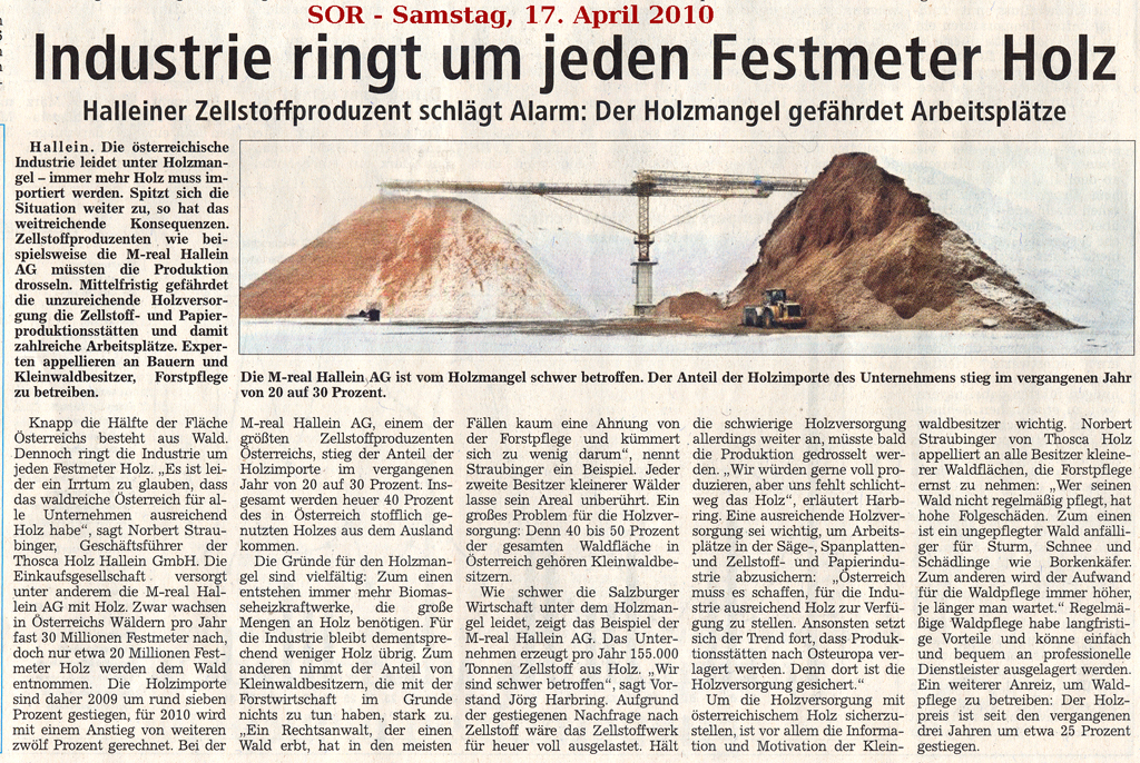 Wie dem nebenstehendem Artikel der Südostbayerischen Rundschau vom 17. April 2010 unmißverständlich zu entnehmen ist, ergibt sich durch die Inflation an Biomassekraftwerken ein erheblicher, arbeitsplatz- und technologiegefährdender Wettbewerb um Holz.