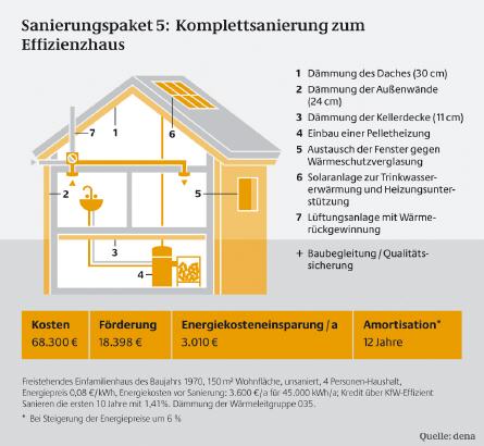 Der ehemalige Altbau wird im Laufe der Sanierung zu einem Effizienzhaus und verbraucht so 50 % weniger Energie als der Gesetzgeber bei einem Neubau einfordert. Die Dämmung des Dachs wird in diesem Fall mit 30 cm Dicke ausgeführt, Aussenwände mit 24 cm und die Kellerdecke mit 8 cm. Die Fenster bestehen aus 2-Scheiben-Wärmeschutzverglasung. Bei der Heizungstechnik schlägt die dena den Einbau einer Pelletsheizung in Kombination mit einer Solaranlage vor, die sowohl die Trinkwassererwärmung wie auch einen Beitrag zur Heizwärme leistet.