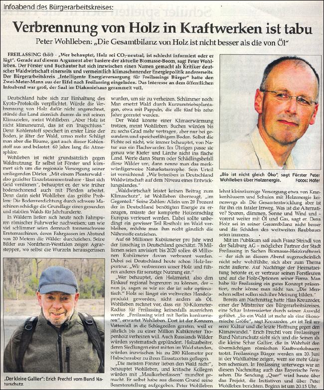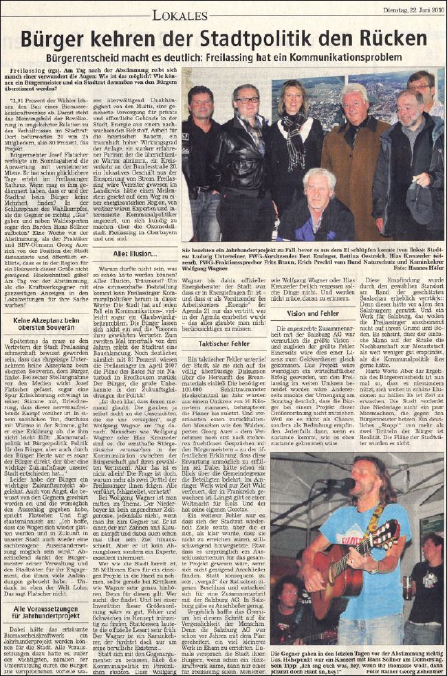 In einem Leserbrief vom 29.05.2010 gesteht nun mit Bernhard Schmähl der erste Stadtrat ein, dass es völlig unrealistisch ist aus der Region auch nur ansatzweise das geplante Heizkraftwerk versorgen zu können. Möglicherweise haben ihm die Freilassinger Waldbesitzer mitgeteilt, dass Anlieferungen unter 10 m3; aufgrund des erhöhten Arbeitsaufwands für den Werksbetreiber ohnehin nicht erwünscht sind. Er gibt aber der Hoffnung Ausdruck, dass dies trotzdem möglich sein wird.