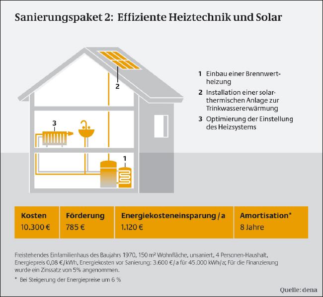 Im zweiten Sanierungspaket, das von der dena vorgestellt wird, betreffen die Sanierungsmaßnahmen die Heizungsanlagentechnik. In diesem Bereich wird der Einbau einer modernen Öl- oder Gasbrennwertfeuerstätte und die Installation einer solarthermischen Anlage für die Trinkwassererwärmung zur Kostensenkung angesetzt. Eine Amortisation der Investitionen sieht die dena nach acht Jahren. |