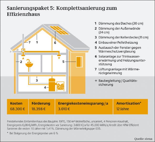 Der ehemalige Altbau wird im Laufe der Sanierung zu einem Effizienzhaus und verbraucht so 50 % weniger Energie als der Gesetzgeber bei einem Neubau einfordert. Die Dämmung des Dachs wird in diesem Fall mit 30 cm Dicke ausgeführt, Aussenwände mit 24 cm und die Kellerdecke mit 8 cm. Die Fenster bestehen aus 2-Scheiben-Wärmeschutzverglasung. Bei der Heizungstechnik schlägt die dena den Einbau einer Pelletsheizung in Kombination mit einer Solaranlage vor, die sowohl die Trinkwassererwärmung wie auch einen Beitrag zur Heizwärme leistet.