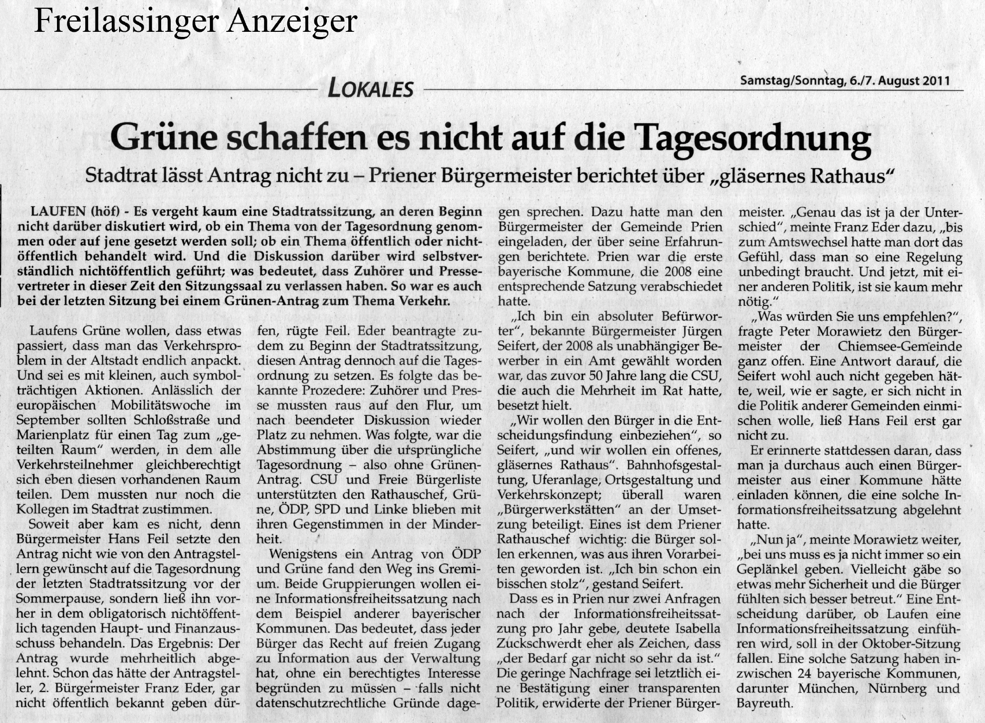 Die Grünen im Laufener Stadtrat hatten die durchaus gute Idee den Informationsfluß von der Politik zum Bürger besser zu gestalten. Nur als "Treppenwitz" kann allerdings die Tatsache bewertet werden dass gerade der Priener Bürgermeister hierzu als vortragender "Gast" eingeladen wurde.