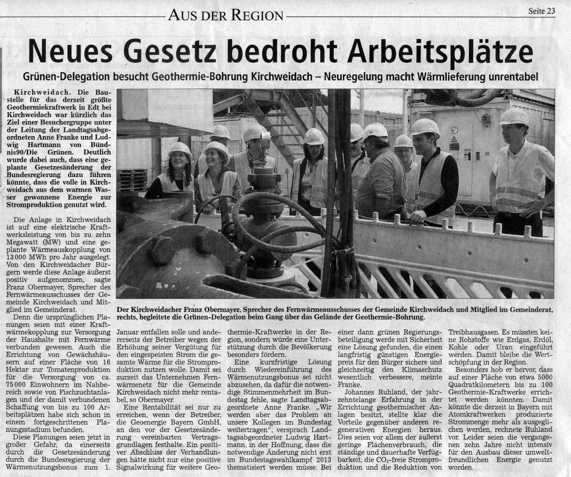 Im oben stehenden Artikel sind die "Risiken und Nebenwirkungen" der "Tiefenwärme" an Hand des Großprojektes in Kirchweidach beschrieben. Nach Fukushima haben die Bundesgesetzgeber vollkommen richtig erkannt dass es keinen Sinn machen kann, Subventionsgelder für äußerst fragwürdige Unternehmen auszuloben welche in letzter Konsequenz nur durch diese Gelder überleben können. Beste Beispiele hierfür gibt es in Österreich und auch in Deutschland an Hand von Biomasse-Heizwerken zu bewundern.