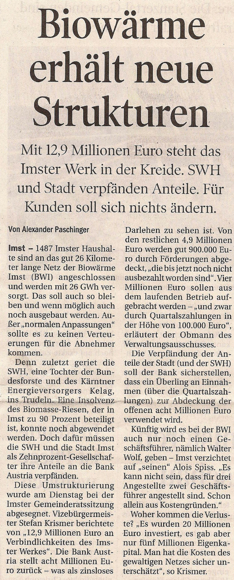 Im zweiten Artikel "Biomasse: Teurer Strom", der diese Woche in den Salzburger Nachrichten erschien, ist auch nochmals der technische Unsinn klar herausgestellt. Die Artikel sollten inklusive Kommentar jedem einzelnen Entscheidungsträger zur Zwangslektüre vorgelegt werden. Unseren Kommunalpolitikern sollte ein für allemal klar gemacht werden, dass die beteiligten Ingenieurbüros ein gutes Geschäftsmodell verkaufen wollen. Es handelt sich auf Neudeutsch vordergründig um eine Win-Win-Lost-Situation. Es gewinnen ganz sicher das Planungsbüro und die ausführenden Firmen, auch der Betreiber wird einige Zeit gewinnen. Ganz klar verliert der Bürger bei diesem Geschäft, da er, wenn die Betreibergesellschaft in Insolvenz geht ja diese auch noch übernehmen muss. Zusätzlich zu dem immensen Betrag den ihn der Umstieg schon gekostet hat. Und dann kostet es jeden Bürger, auch den der nicht angeschlossen ist. Denn der Bürgermeister muss mit seinem Rat für die fortgesetzte Versorgung derer sorgen die sie vorher in die "Abhängigkeitsfalle" gelockt haben. Siehe Österreich. Insolvente Werke wurden bereits durch Gemeinden übernommen.