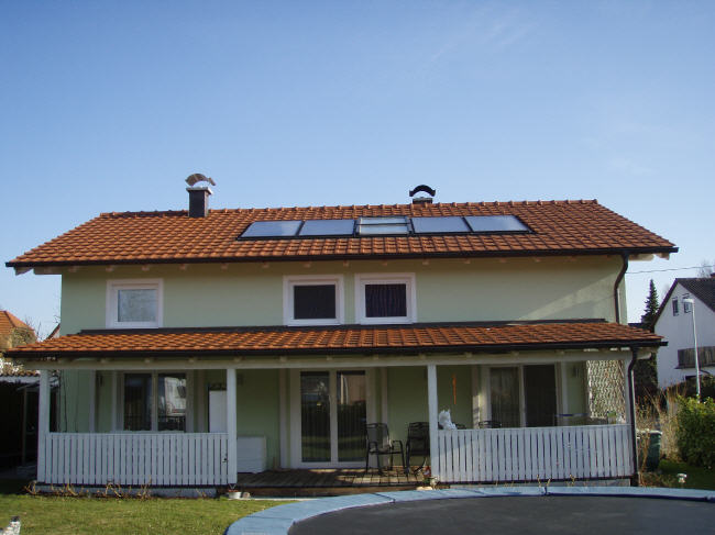 | Einfamilienhaus, 270 m2, oberflächennahe Erdwärme, Thermosolar, Biomasseküchenherd - wasserführend, kontrollierte Be- und Entlüftungsanlage; Bild 1 Hausansicht, Bild 2 Küchenherd, Bild 3 Warmwasserspeicher, Bild 4 Wärmepumpe, Bild 5 Wärmepumpe Innenansicht, Bild 6 Sammler - Erdkollektor, Bild 7 Außenansicht kontrollierte Be- und Entlüftung, Bild 8 Innenansicht KWL, Bild 9 Ansaugluft-Kühlung |  |
